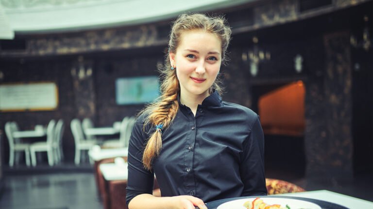 Tragen Sie stets saubere und gepflegte Arbeitskleidung: eine schwarze, elegante Stoffhose in Kombination mit Hemd oder Bluse. Ihre Schuhe sollten ebenfalls gepflegt und bequem sein, da Sie überwiegend stehen werden.