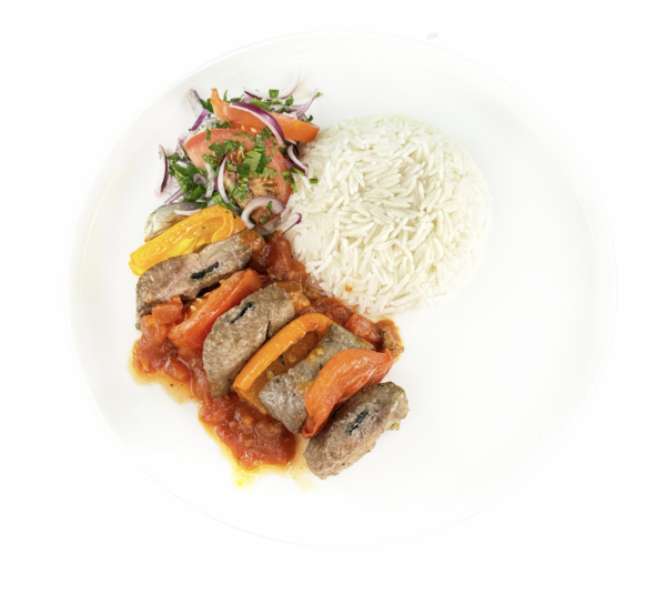 Schaschlik mit Rindfleisch, Gemüse und Reis