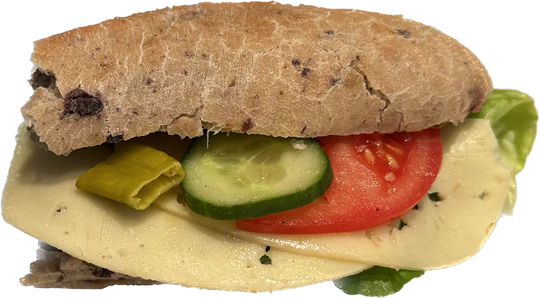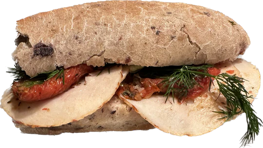 Olivenbrot mit Pute, saures Gürkchen, Paprika