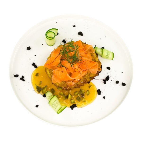 Räucherlachs auf Reibekuchen und Creme Fraiche