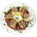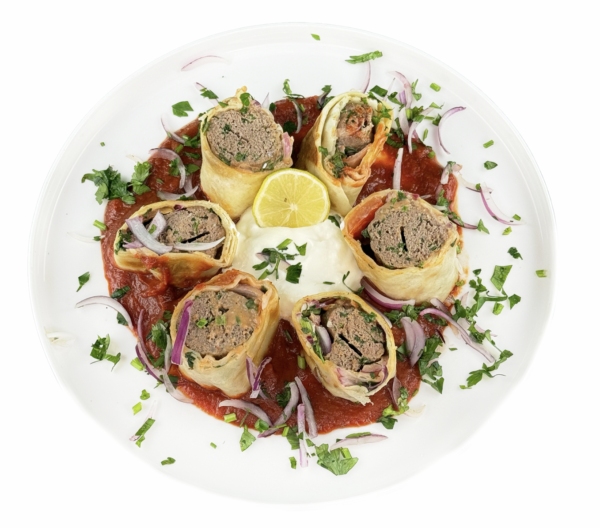 Rindfleisch am Spieß gegrillt, in Lavash gewickelt mit Tomatensauce und Joghurt